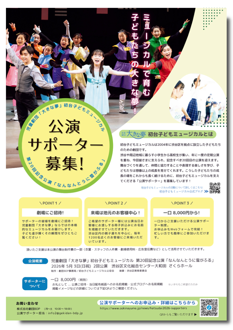 初台子どもミュージカル・第20回記念公演サポーター募集!